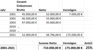 In diesem Beispiel wäre ich in der Lage gewesen in den letzten 20 Jahren ein Vermögen von 175T€ auf zu bauen was einer Durchschnittlichen Sparquote oder Sparleistung von 25% entsprochen hätte.
